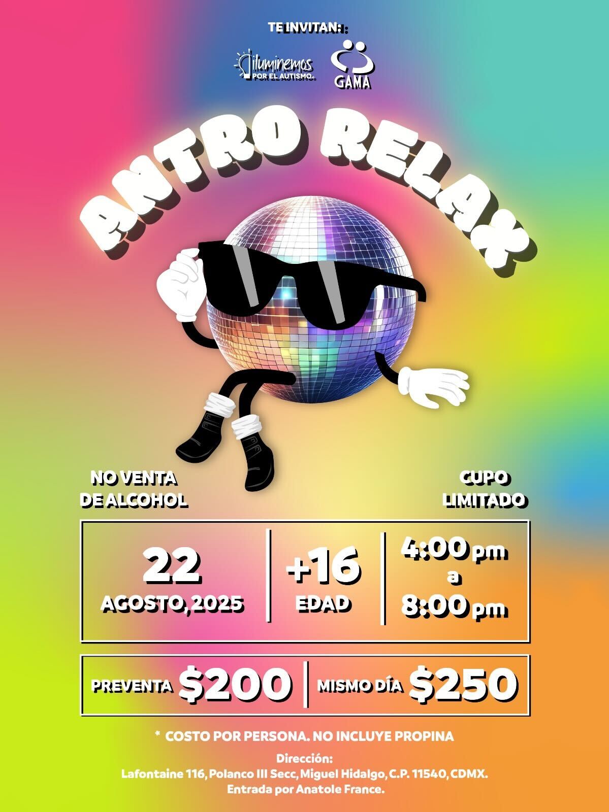 Al ser una tardeada relajada, la música no se tendrá en su totalidad. Puedes llevar audífonos canceladores de ruido si lo deseas.